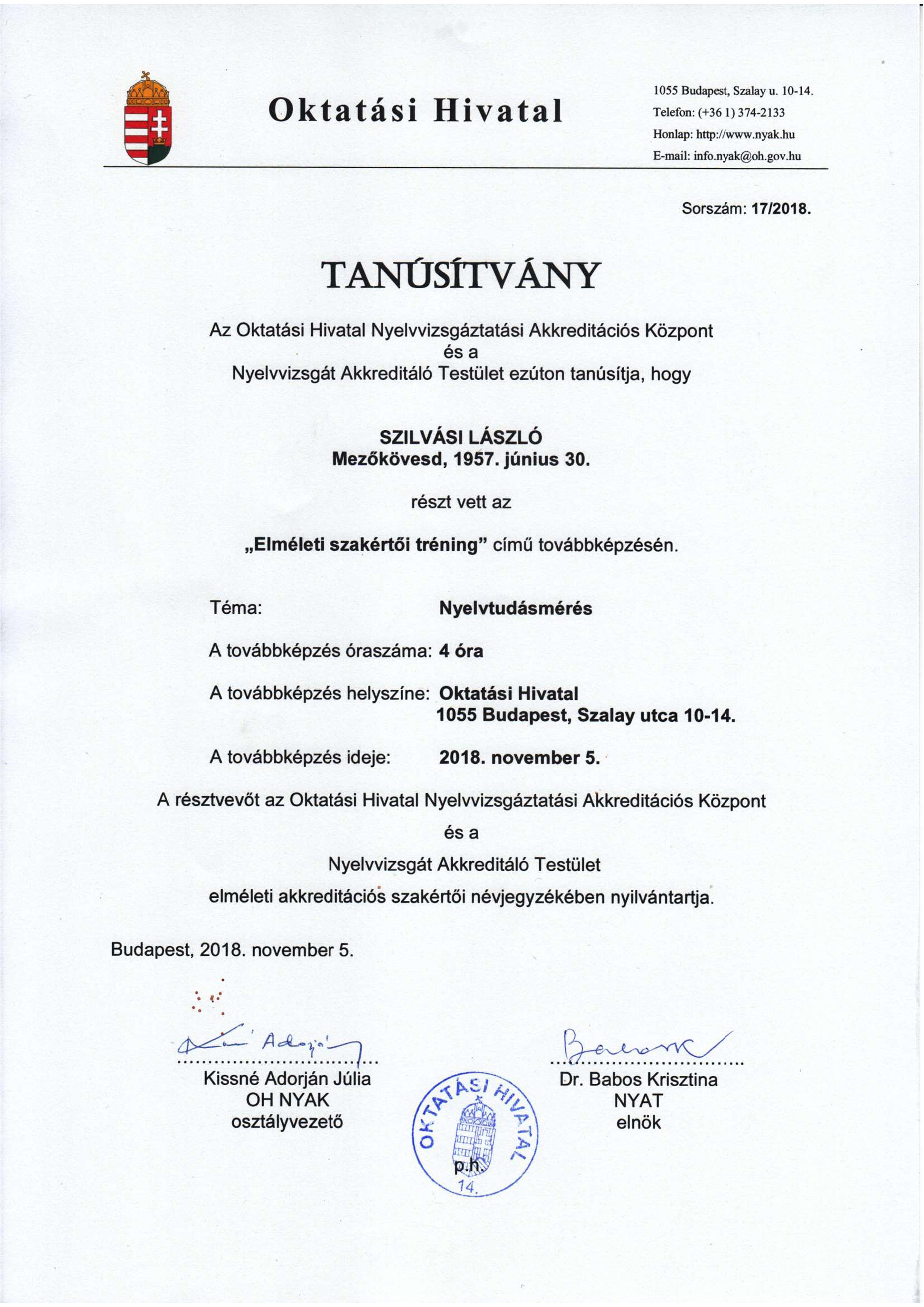 2018-ban - Oktatási Hivatal (Minisztérium) - szakértő
